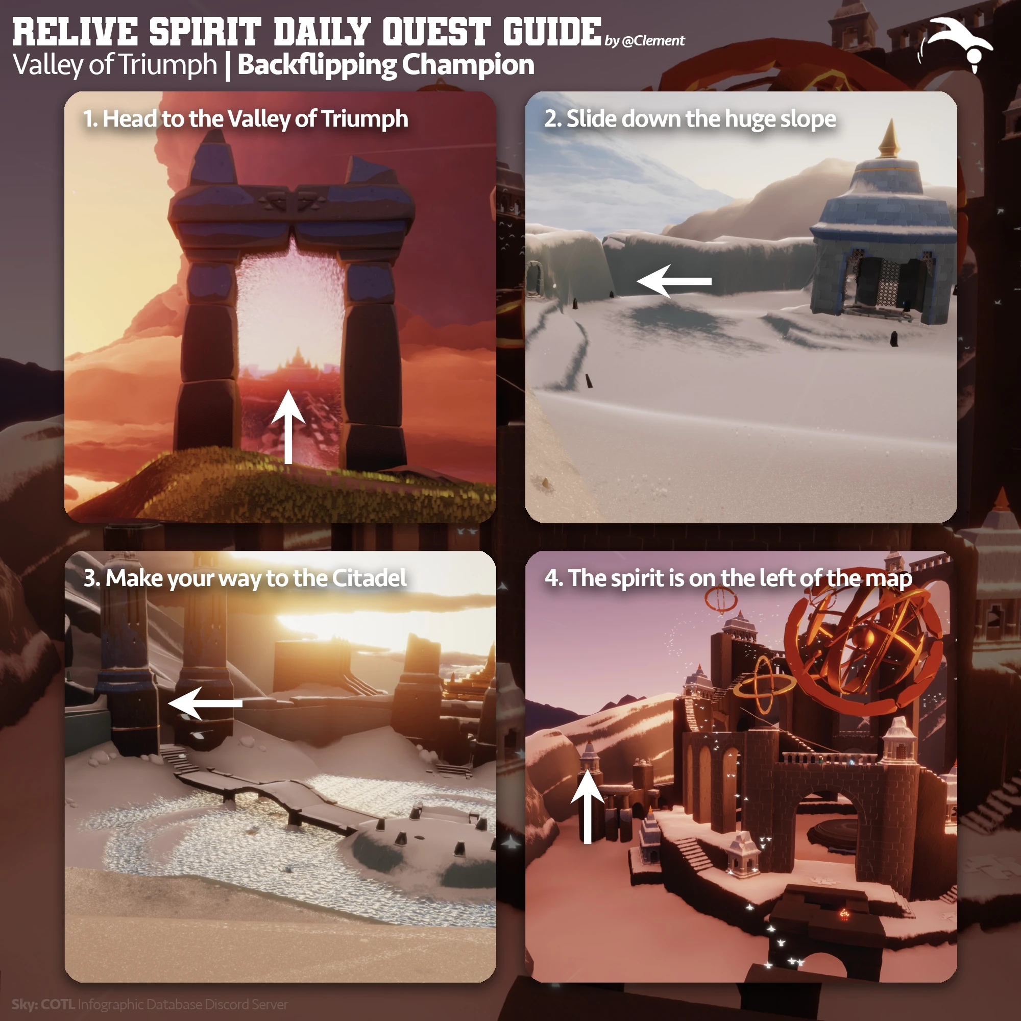 - Antes de dezembro de 2020, o Campeão dando Cambalhota era um dos dois Espíritos (o outro era o Medalhista Curvando-se) encontrados na Corrida do Voo. Os jogadores tinham que voar até o Espírito durante a corrida para receber sua Expressão no final dela, no Coliseu. Após a atualização 0.13.0, o Campeão dando Cambalhota e o Medalhista Curvando-se foram realocados e receberam memórias para serem revividas.